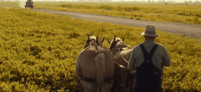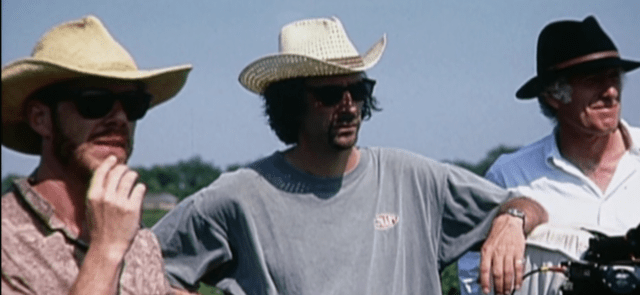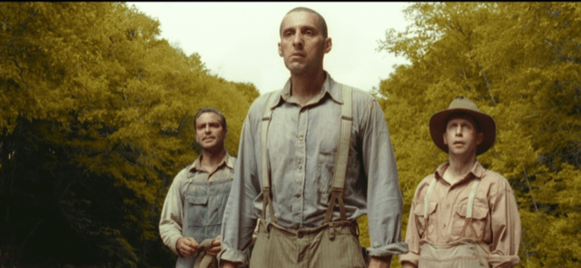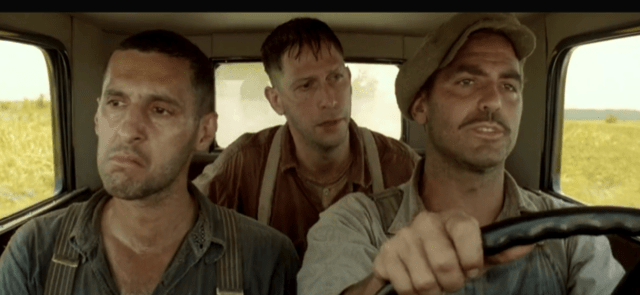 This film is so good-natured, it’s near impossible to dislike. At the same time, it’s too good-natured to be an all-time great. As I watched it this week, I noticed how the Coen brothers and cinematographer Roger Deakins employ the three shot several times in the movie for masterly comic effect. A three shot is a type of shot in which the frame features three figures, usually characters, and in O Brother, Where Art Thou? typically expressive faces. A three shot in a comedy is an efficient tool. It allows reaction shots from multiple characters simultaneously and avoids cutting and disruptive changes. This film has some variations, but many of the screengrabs below include the movie’s mains Everett, Delmar and Pete watching something or reacting to something from near identical POVs.