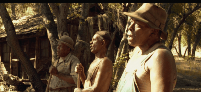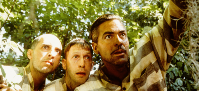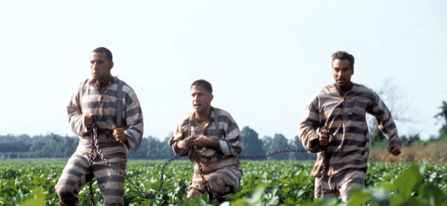 Still in their prison garb. This time they are encountering Pete’s cousin Wash together. Note that Delmar is often in the middle. The taller men frame him.