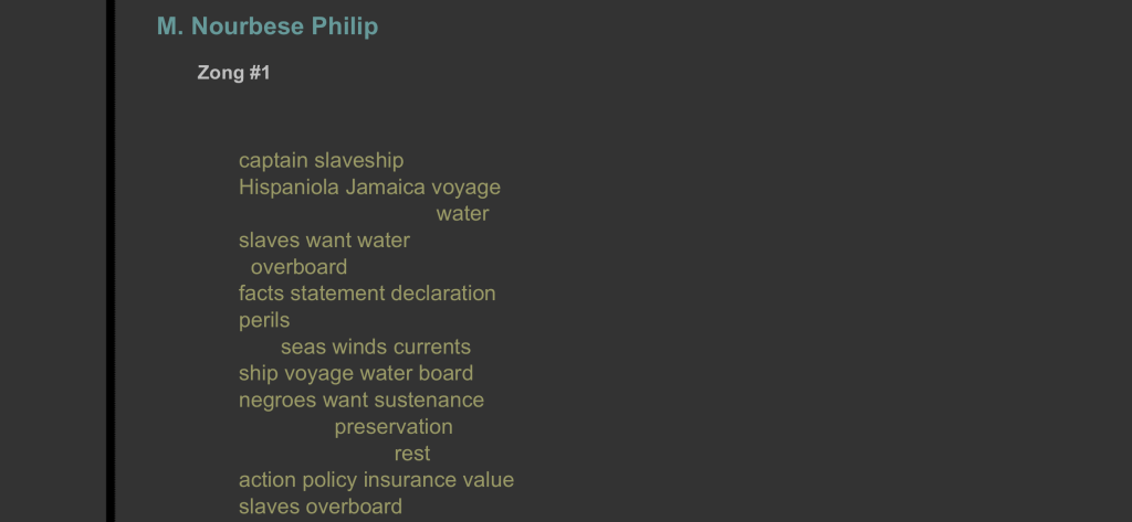 Philip wails out the lives of the people massacred on the Zong. Like Turner she paints a picture of a creaking ship beset by heaving waves. But out of that ragged material she has made something far more personal and holy. We get a sense of actual persons destroyed. We are spattered by history’s bitter spray. It is not the spectacle of loss that Philip foregrounds but rather the interwoven hurt of these people, not impossible limbs as painted by Turner but possible lives taken from people for whom, in the absence of records, she has conjured credible names: Muru, Kakra, Kolawole, Kibibi, Olabisi, Usi, Kenyatta, Mesi, Nayo, Yooku, Ngena, Wale, Sade, Ade.